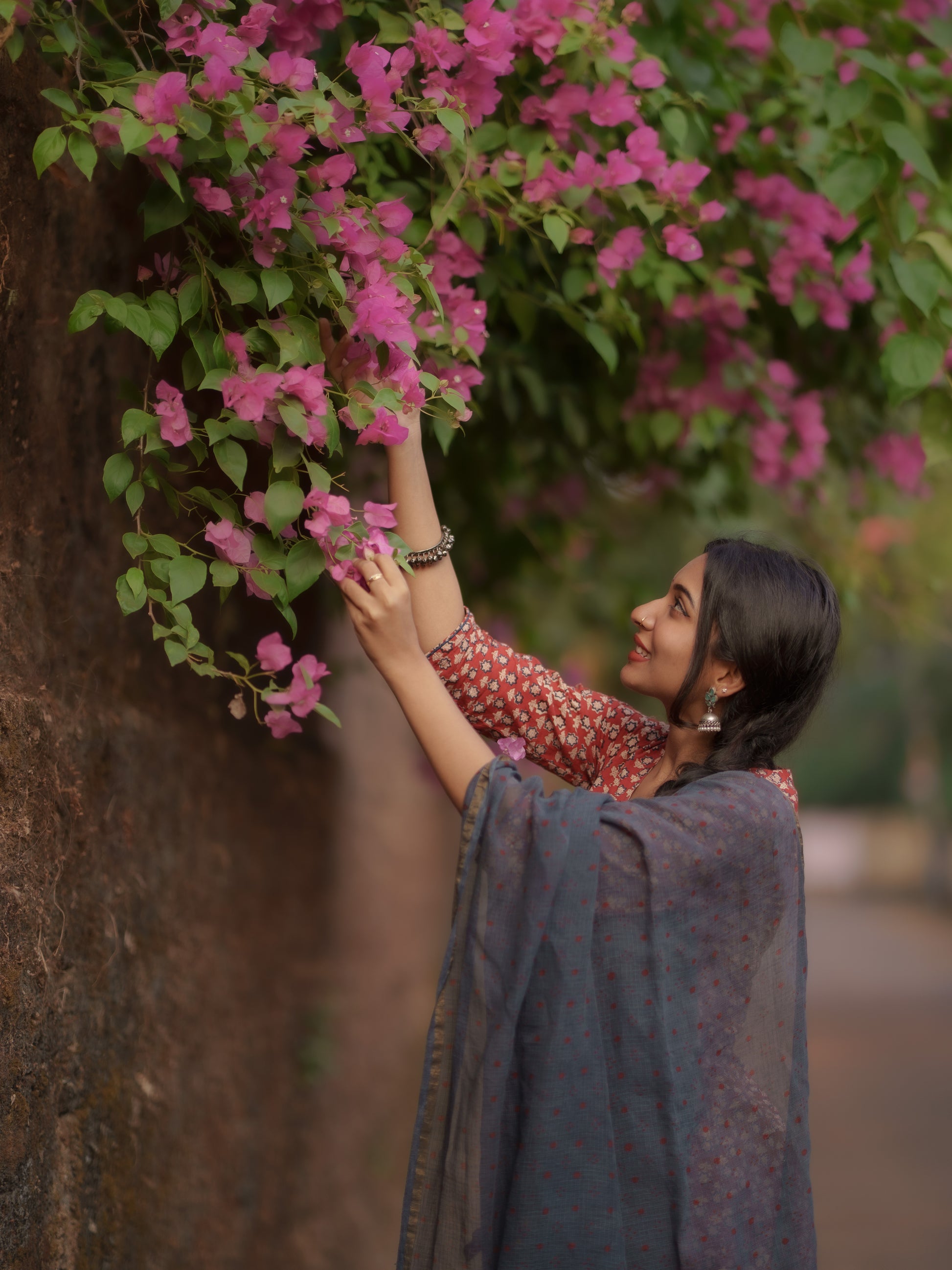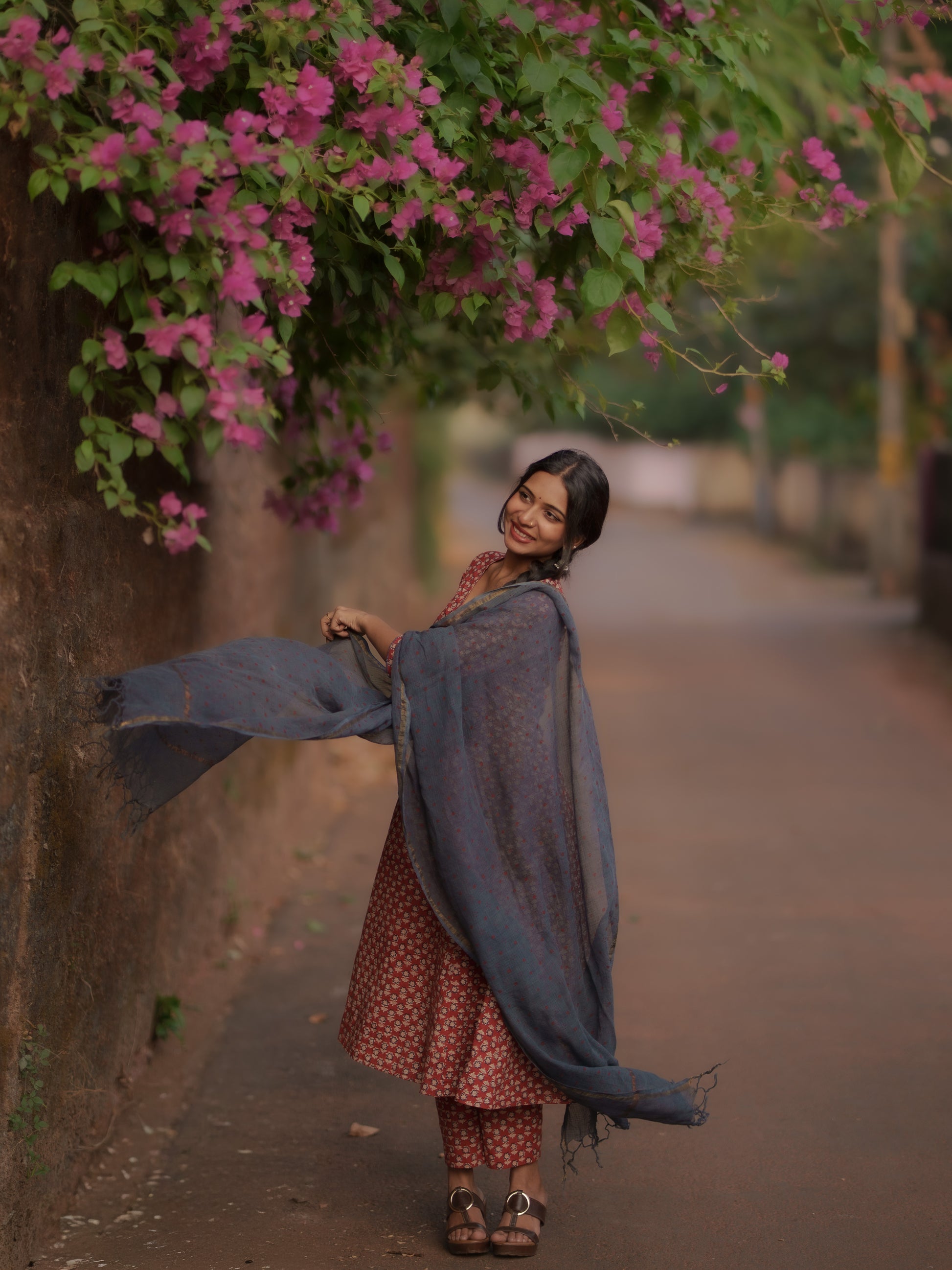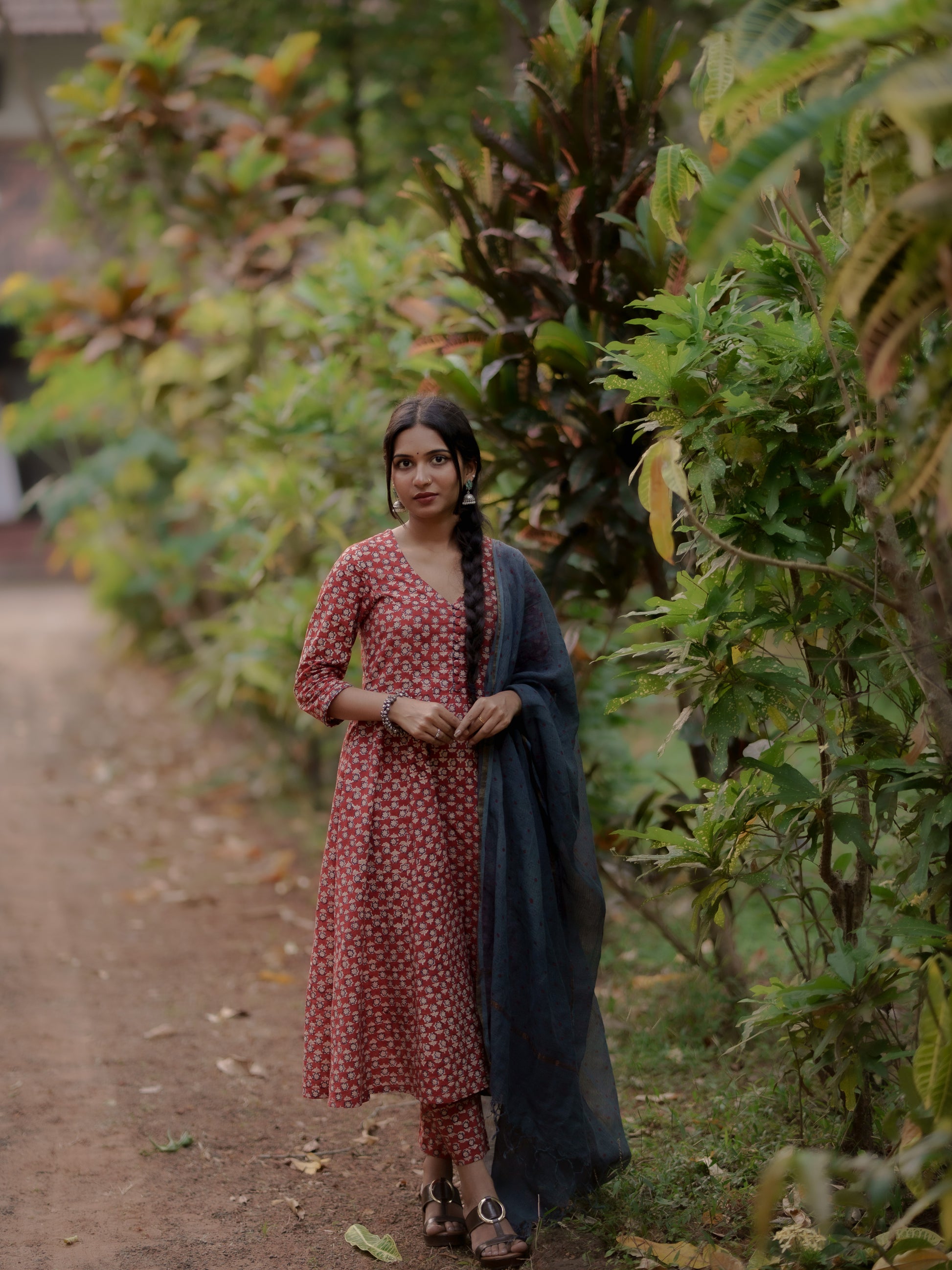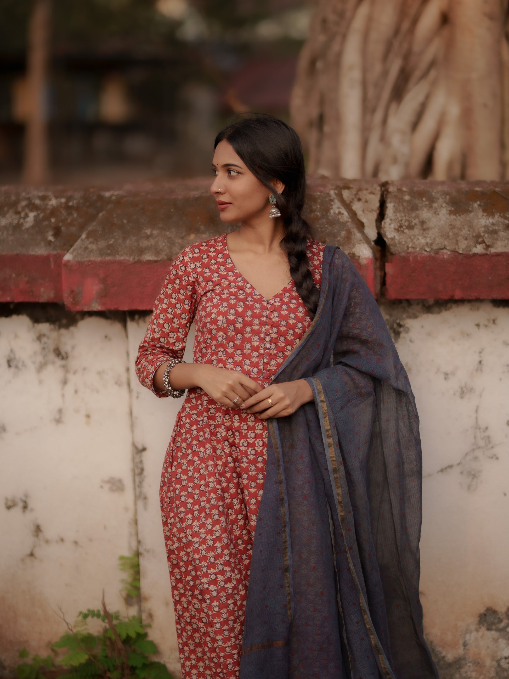 Introducing the luxurious and exclusive Maya Madder Red Bagru Co-ord Set. Hand Block Print natural dyes bring depth and vibrancy to this KALIDAAR, FLARED silhouette. With pockets in both the Kurta and pants, this set is perfect for festivities. Complete the look with the Indigo Ajrakh Hand Block printed Kota Dupatta, adding a unique charm. Versatile for all body types and occasions, from workwear to casual wear to festivals.