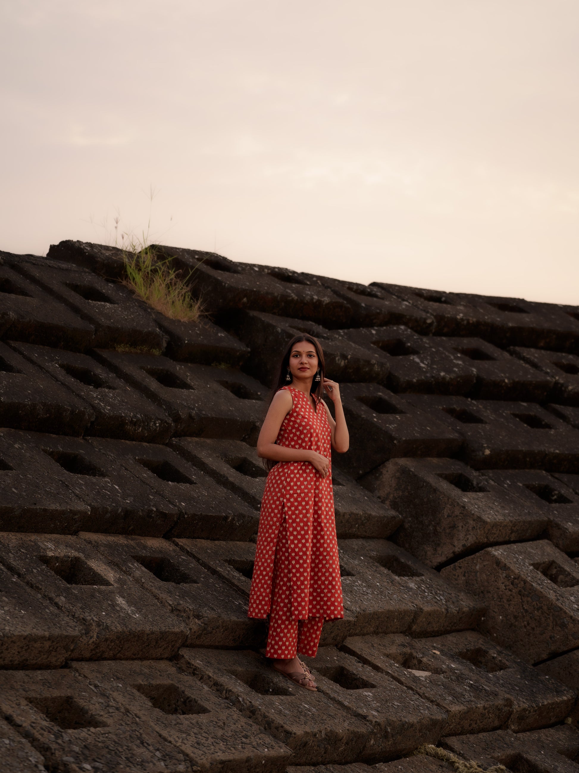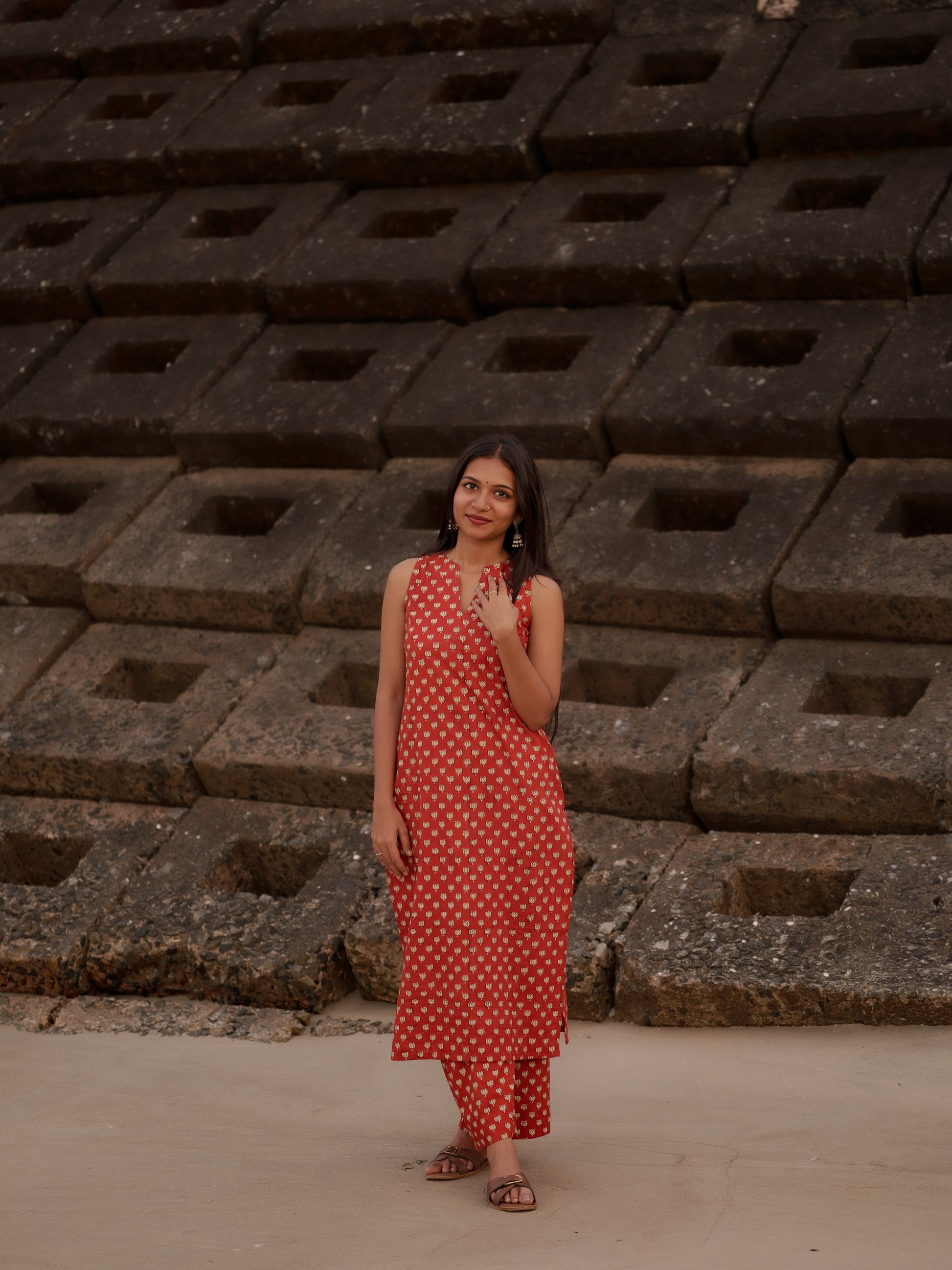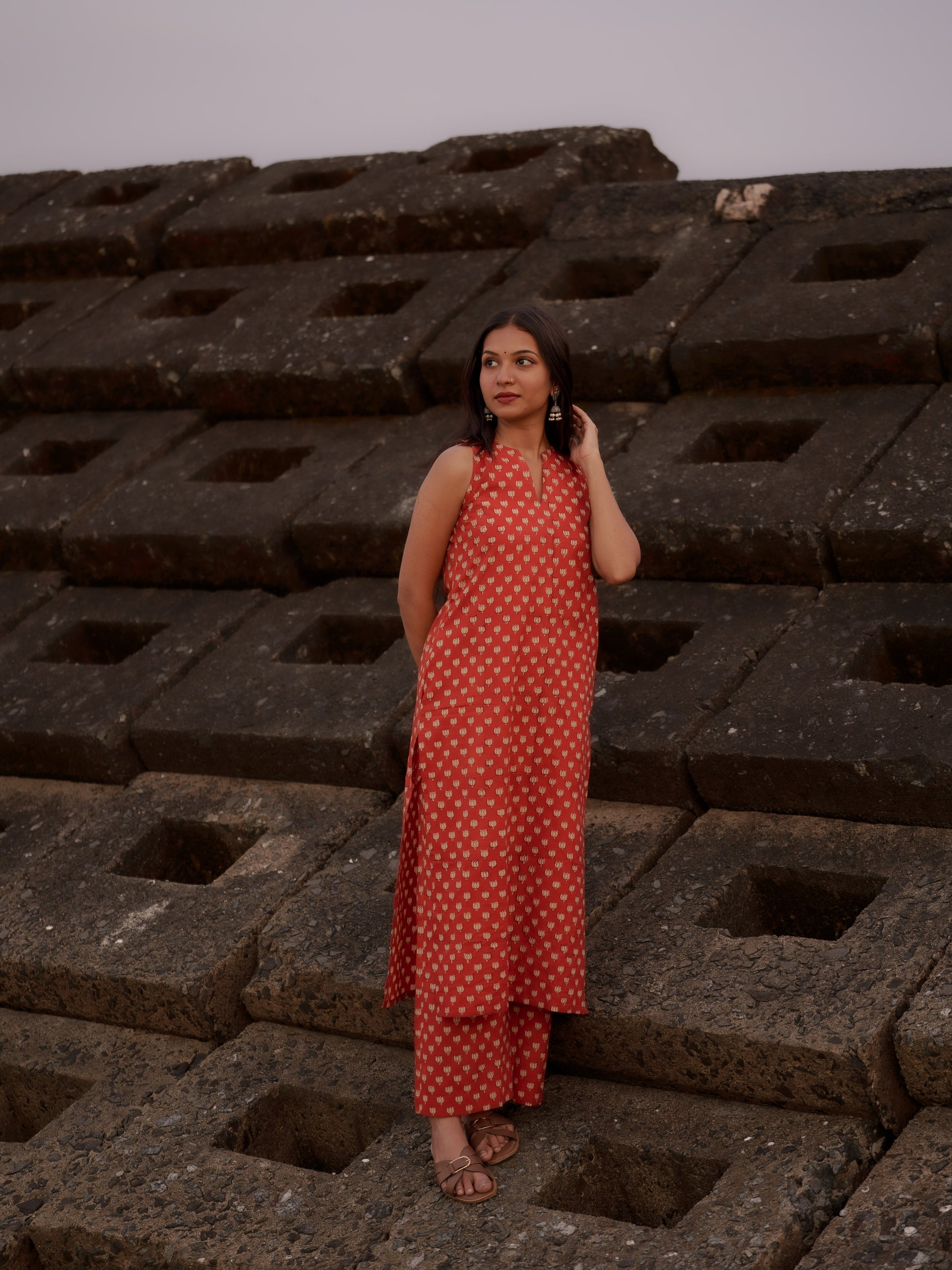 Indulge in the luxurious beauty of our Gamyam Madder Red Bagru Co-ord Set. Handcrafted with natural dyes and intricate hand block printing techniques by 8th generation artisans from Rajasthan's famous Bagru village. Each piece is a testament to traditional craftsmanship and brings a touch of elegance to your wardrobe. Embrace sustainable fashion with our stunning Bagru collection.