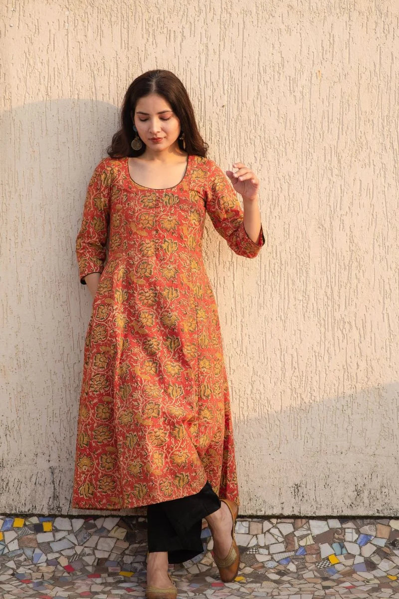 Ishq is a natural dyed pumpkin shaded kalamkari kalidaar kurta with hand block prints, contrast mehndi green piping with pockets of course! The kurta has loop detailing in the front.