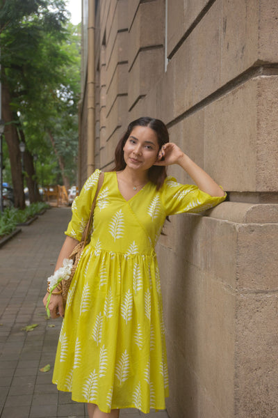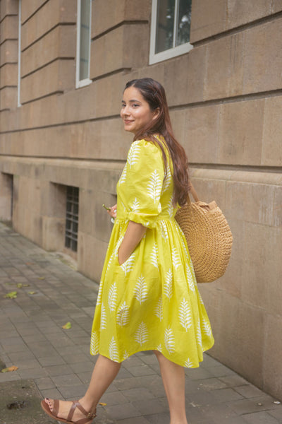 Say hello to Venice, your new-season BFF! This cotton yellow handblock printed dress is the perfect pick for any occasion. With tie strings on the sides and fit-n-flare design, you can style it to your heart's content. Plus, pockets always add that extra oomph. Now let's show 'em what you got!